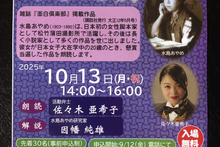 今回、蒲田図書館において、小説家・水島あやめの小説作品の朗読会が企画されました。 水島あやめは、松竹キネマ蒲田撮影所で唯一の女性脚本家として昭和初期の女性たちの憧れの脚本家として活躍したことは、近年ようやく知られてきまし… 続きを読む »【ご案内】10月13日 水島あやめ作「形見の繪姿」朗読会の開催 ➡ 終了しました。