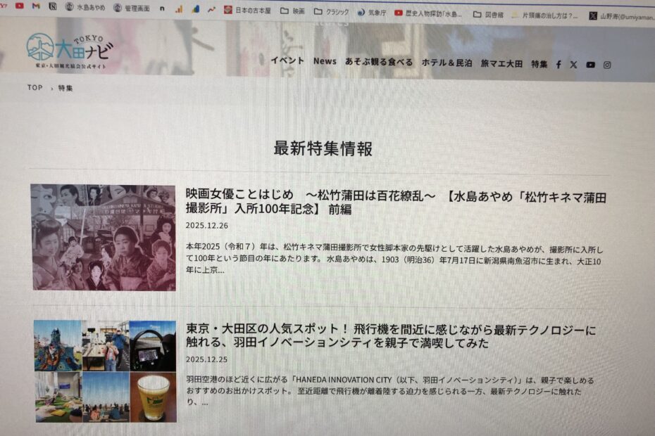 2025年12月26日、東京・大田観光協会公式サイト〈大田ナビ〉にて、「水島あやめ『松竹キネマ蒲田撮影所』入所100年記念」企画がアップされました。 今回はその前篇として、蒲田映画祭をプロデュースされた岡茂光さんが、松竹… 続きを読む »【ご紹介】大田ナビ「水島あやめ『松竹キネマ蒲田撮影所』入所100年記念」前編を公開